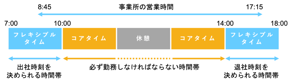 | フレキシブルタイム | 始業・終業時刻を決められる時間帯 |
